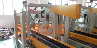 紙箱通過(guò)流水線輸送到折蓋封箱機(jī)處,折蓋封箱機(jī)自動(dòng)啟動(dòng)折蓋機(jī)構(gòu),然后對(duì)紙箱上蓋進(jìn)行折合并且同時(shí)進(jìn)行膠帶黏貼和輸送。