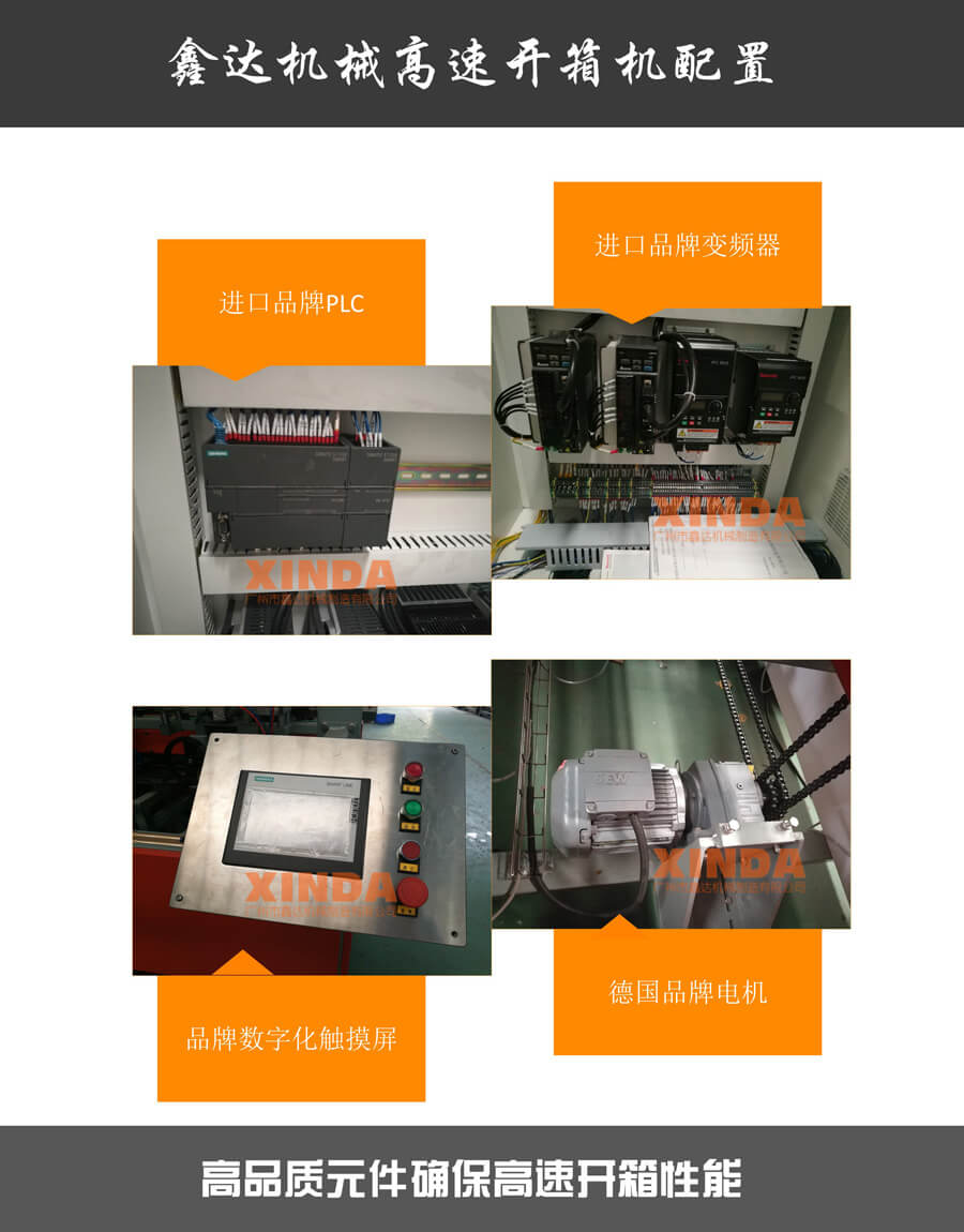 鑫達機械高速開箱機目前速度分為12箱立式開箱機、15箱臥式開箱機、25箱臥式開箱機、35箱臥式高速開箱機以及45箱高速開箱機5種速度型號,其中立式開箱機是采用吸盆吸取成型、皮帶傳輸;而臥式高速開箱機統一采用進口德國品牌SEW電機傳動、臺灣臺達伺服電機成型、德國費斯托真空吸盆,自強鏈條品牌傳輸、西門子PLC核心控制系統;以上高品質零配件確保了鑫達機械高速開箱機的持續開箱能力達95%以上,紙箱損壞率在千分之一以內,采用此款高速成型機,確確實實的保證了客戶的耗材成本。