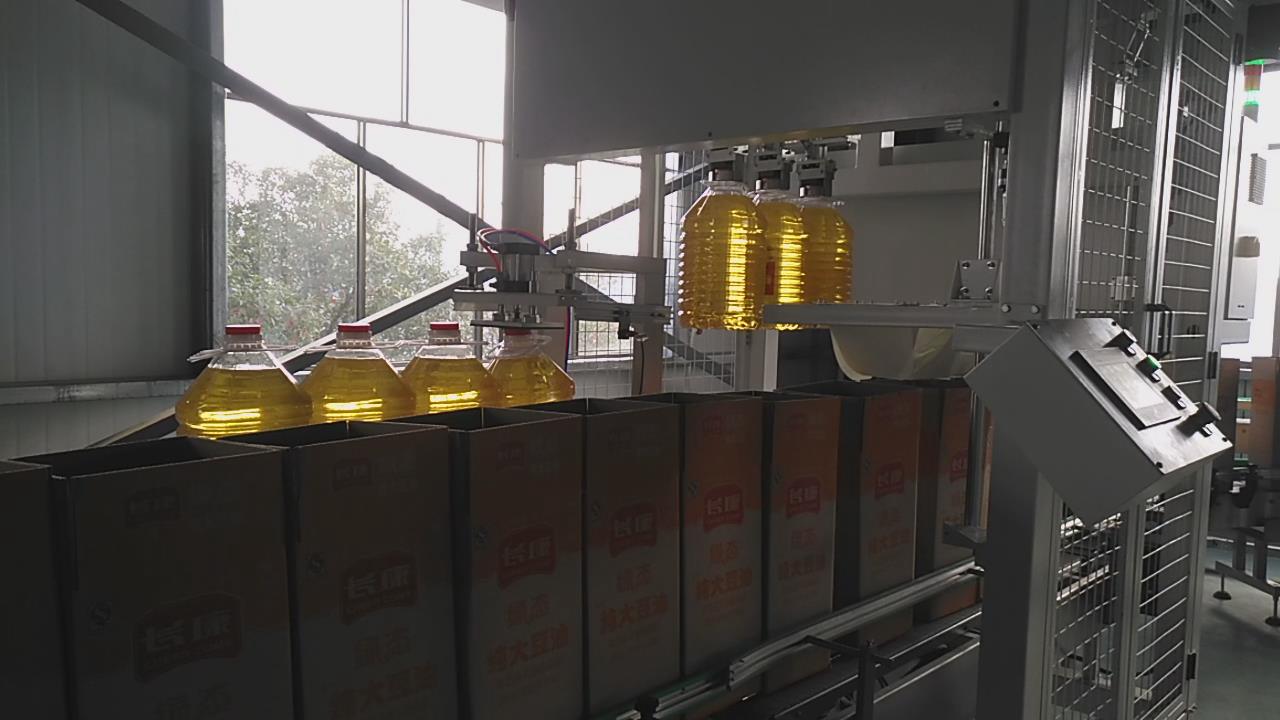 500ML、5L等瓶裝類食用油機(jī)器人自動(dòng)裝箱