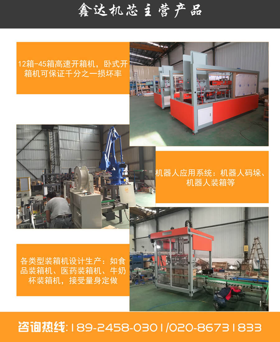 鑫達機械簡介:是一家致力于二次包裝生產線自動化設備的供應商,核心產品是高速開箱機、各類型非標裝箱機、機器人應用系統等,目前已和怡寶、益海嘉里、中糧等企業聯合,往中國企業制造強國邁進。