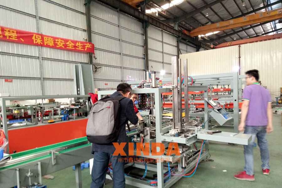 意向茶葉企業(yè)客戶正在檢查小罐茶葉裝箱機生產(chǎn)進度,并對困惑問題提出指導(dǎo)解決
